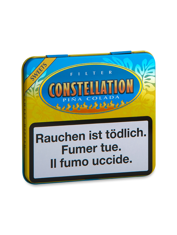 Zeit für frische Früchte! Das erste Filterzigarillo mit dem legendären Geschmack eines Piña Colada. Verlieren Sie sich in sommerlichen Wellen von süsser Ananas und erfrischender Kokosnuss. Die CONSTELLATION PIÑA COLADA hat den Geschmack, der Ihre Sehnsucht nach dem Sommer stillt.