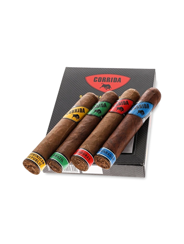 Rauchgenuss aus vier Ländern CORRIDA zeigt sich schon seit ihrer Einführung als Zigarrenmarke mit starkem Charakter. Die Sampler der Robusto+ vereinen in sich die Charakeristika aller vier Länder. Sie bieten mit vier Farben, vier Kompositionen und vier Herkunftsländern ein komplettes und vielseitiges Raucherlebnis. Die CORRIDA Sampler sind ein facettenreicher Mix für jeden Aficionado!