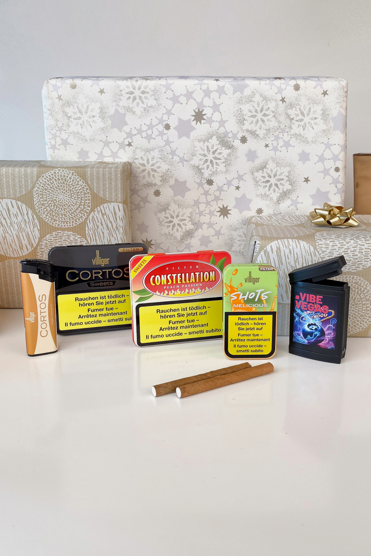 Aromatic cigarillo sets with a selection of VILLIGER CORTOS Sweets, CONSTELLATION Peach Passion, and VILLIGER SHOTS Melicious, complete with one exclusive pocket ashtray and one  lighter.