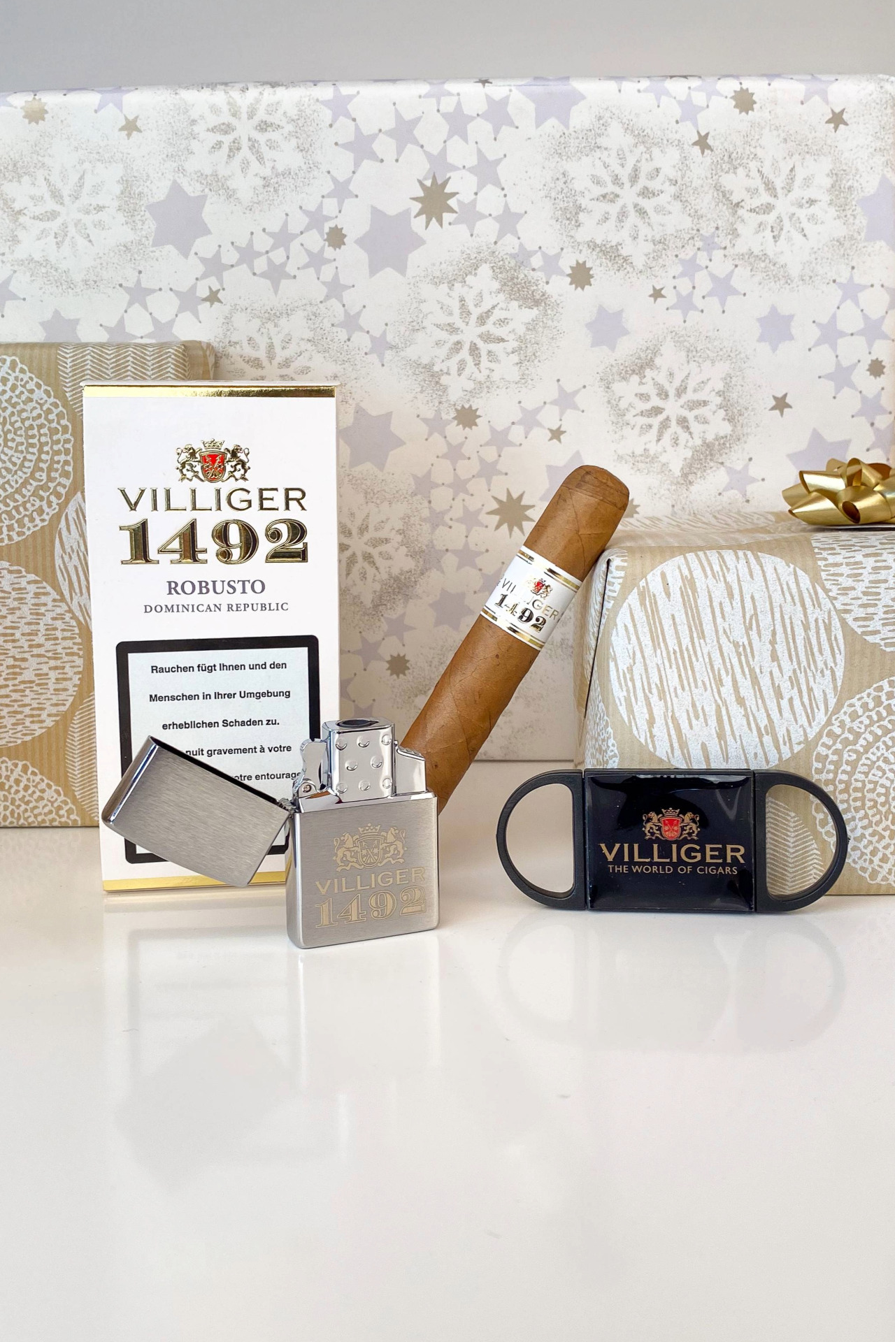 Each set includes three premium VILLIGER 1492 Robustos, one VILLIGER 1492 Zippo, and one handy VILLIGER cutter.