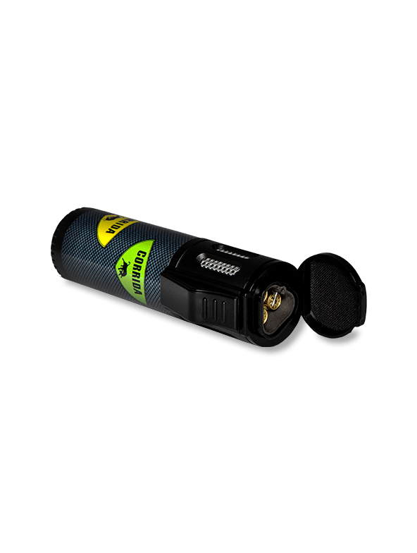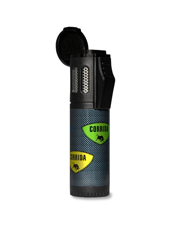 The practical and stylish Jet Flame lighter with the CORRIDA logo ensures that your cigar lights effortlessly, no matter how windy it gets. The high temperature combined with the strong, steady flame produces a precise focal point, making it easy to light a cigar, especially outdoors. The refillable Jet Flame is made of plastic featuring a carbon-style finish, printed with the iconic CORRIDA logos in all four colors, and comes in a stylish box.