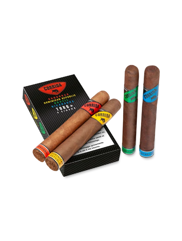 Smoking pleasure from four countries CORRIDA has been a cigar brand with a strong character since its launch. The samplers of the Robusto+ combine the characteristics of all four countries. With four colors, four compositions and four countries of origin, they offer a complete andversatile smoking experience. The CORRIDA samplers are a multifaceted mix for every aficionado!
