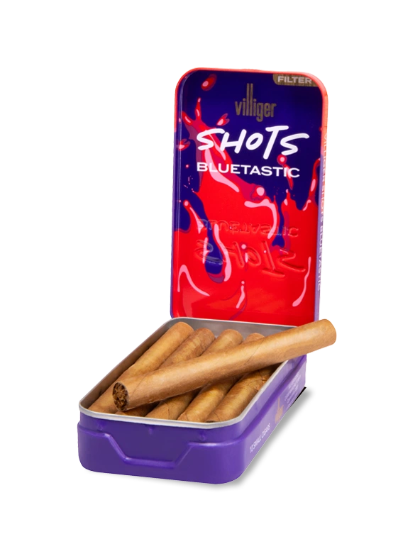 Discover the fascinating world of #vibevegas - take a trip to the glittering metropolis and enjoy the special vibe. The VILLIGER SHOTS Bluetastic contain a pleasant, mild tobacco blend with an intense kick of fruity blueberry. The fruity sweetness at the mouthpiece rounds off this special smoking experience. The VILLIGER SHOTS Bluetastic cigarillos are packaged in a high-quality metal case and feature a special glow-in-the-dark effect on the SHOTS logo.