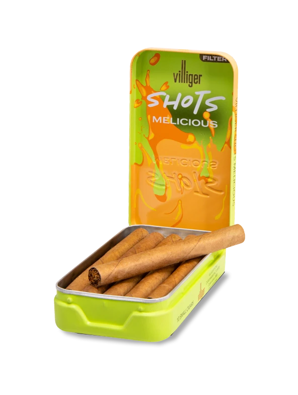 The VILLIGER SHOTS Melicious cigarillos are packaged in a high-quality metal case and feature a special glow-in-the-dark effect on the SHOTS logo.
