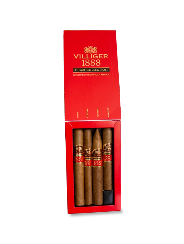 Le VILLIGER 1888, nommé d'après l'année de la fondation de Villiger, a été le premier cigare premium fabriqué à la main à porter le nom de VILLIGER. Il surprend par sa fumée complexe et équilibrée, destinée aux amateurs de cigares de force moyenne, composés de tabacs provenant des meilleures zones de culture. Sa composition provient de Heinrich Villiger lui-même, ce qui fait de ce cigare quelque chose de très spécial.