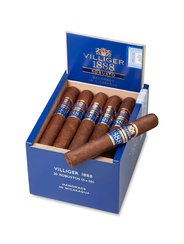 La date historique «1888», qui correspond à l'année de création de l’entreprise VILLIGER, a donné son nom au premier cigare fait main de la maison VILLIGER: le VILLIGER 1888. Aujourd’hui, c’est un autre cigare tout aussi exceptionnel qui est autorisé à porter ce nom prestigieux: le VILLIGER 1888 Nicaragua, le dernier-né dans l’univers des cigares! Disponible en quatre formats - Coronita, Robusto, Toro et Perfecto - dans un élégant coffret bleu foncé de 20 pièces qui attirera tous les regards dans un humidor. Caractère: tabac d’intensité moyenne, offrant une expérience de combustion agréablement aromatique, avec des arômes discrets de cuir et de poivre Saveur: expression fraîche et agréable en bouche, avec des notes de chocolat et de miel.