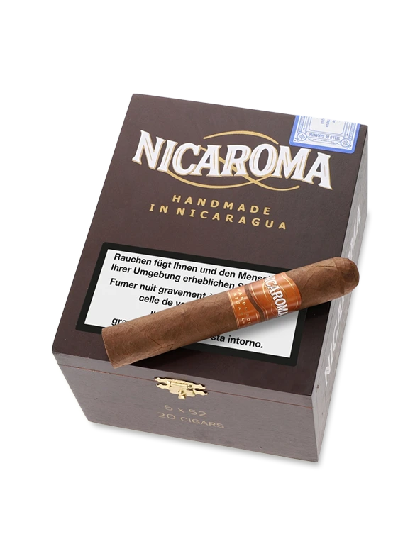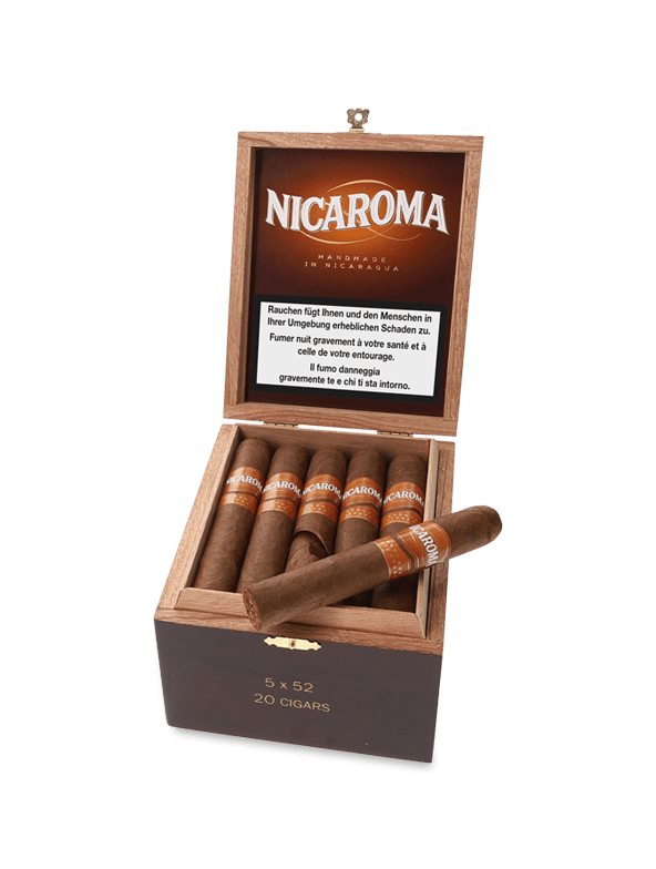 NICAROMA – ein Name, der zwei Dinge verbindet und die Brücke schlägt zwischen Nicaragua und der Vielfalt der Aromen. Diese vollmundigen und spannenden Zigarren, meisterlich von Hand gerollt, verbinden die feinen Aromen Nicaraguas und werden zu einem ganz besonderen Rauchvergnügen. Leder und Naturverbundenheit sind die Schlagworte, die beim Genuss dieser Zigarren sofortaufblitzen. Abends am Lagerfeuer geniessen Sie eine schöne NICAROMA und lassen die Gedanken schweifen. Einfach unvergleichlich. Geschmack: Gekonnt komponiert und facettenreich verspricht diese Zigarre dem Kenner nicaraguanischer Zigarren ein wahres Geschmackserlebnis. Auch die „Nicaroma 5 x 52“ besticht durch einen Durchmesser von deutlich über 20 mm. Gekonnt komponiert und, wie alle drei Formate von Hand gerollt, ist sie der perfekte Abschluss eines feinen Essens, sowohl am Mittag als auch am Abend.
