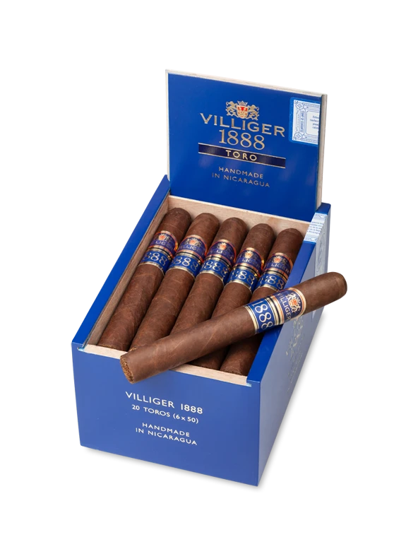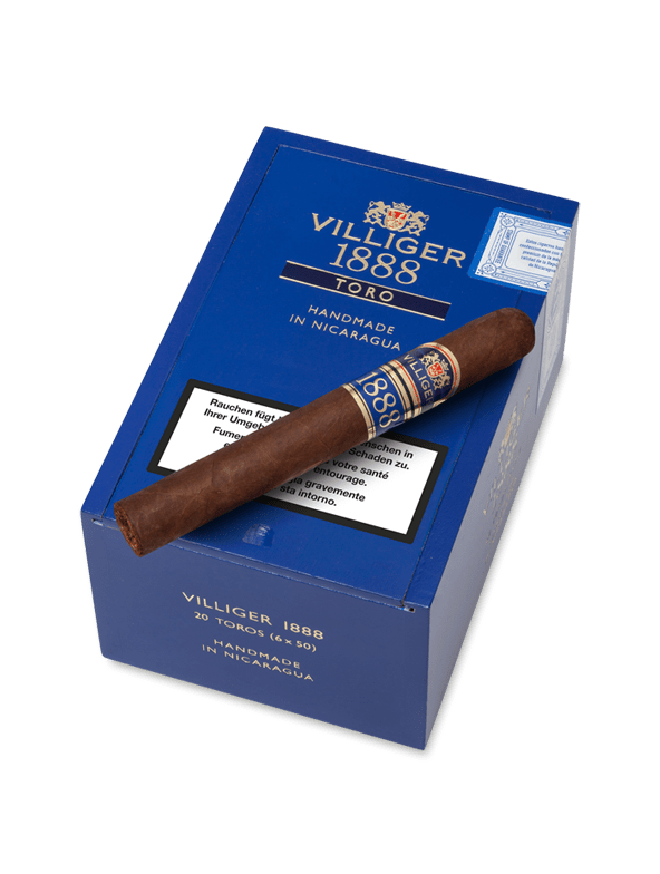 Aus dem geschichtsträchtigen Datum „1888“ - dem Gründungsjahr von VILLIGER - entstand die erste eigene Handmade Zigarre aus dem Hause VILLIGER: die VILLIGER 1888. Darauf folgt nun die nächste hervorragende Zigarre, die diesen grossen Namen tragen darf: VILLIGER 1888 Nicaragua - der neue Stern am Zigarrenhimmel! Erhältlich in vier Formaten Coronita, Robusto, Toro und Perfecto in einer edlen dunkelblauen 20er Cabinett-Kiste, die in jedem Humidor zum absoluten Blickfang wird. Charakter: mittelkräftige Tabake, die ein angenehm aromatisches Raucherlebnis bieten, mit dezenten Aromen von Leder und Pfeffer Geschmack: kühl und wohlschmeckend im Ausdruck, mit Anklängen an Schokolade und Honig.